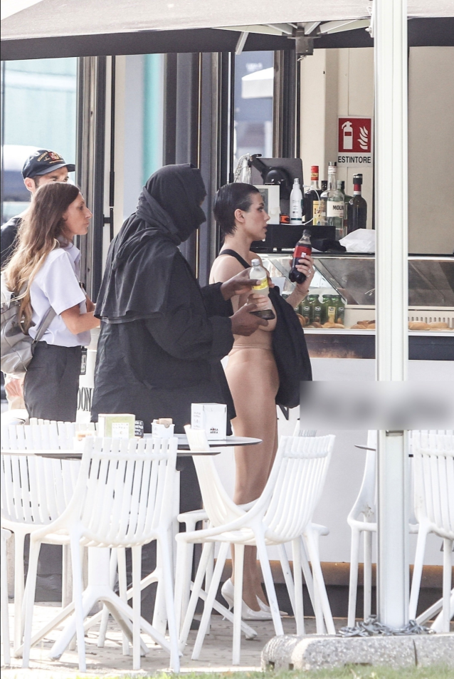 카니예는 이탈리아의 뜨거운 태양에도 불구하고 검은 옷을 여러 겹 입고 행사를 위해 가렸습니다.